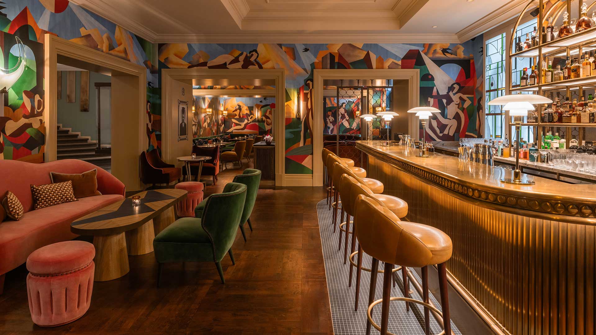Spicca la coloratissima carta da parati, ispirata al dipinto di Magritte ‘Femmes’ (1922) e creata per fare pendant con le vetrate in stile art déco. Ad arricchire il posto ci sono un bancone in ottone, divani e sedie in velluto, tavolini in legno. Tutto selezionato unendo giocosità (che tende a includere) e coerenza (che pone limiti alle aperture).
