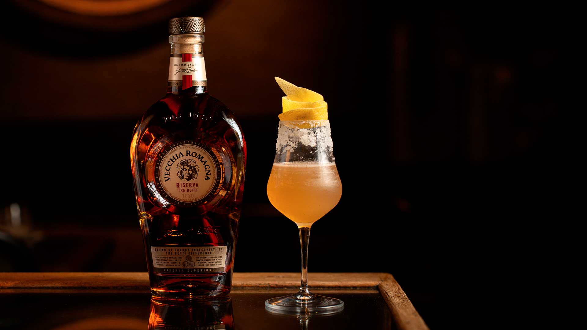 In un mixing glass mescolare Vecchia Romagna Riserva Tre Botti, succo di limone, Cointreau, maraschino Buton e Angostura. Bagnare il bordo del bicchiere con il limone e poi immergerlo nello zucchero.