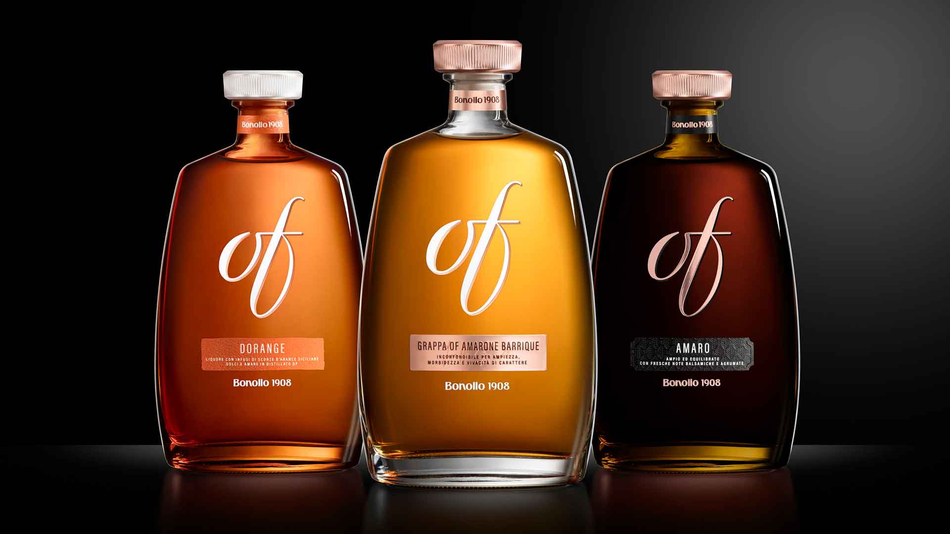 L’etichetta, essenziale ed elegante, riporta il marchio OF che, con la dicitura “Bonollo 1908”, sottolinea il legame tra contemporaneità e storia familiare. «Abbiamo l’ambizione di diventare il gusto della bellezza», continua Bonollo, «ma è anche un invito a gustare la bellezza». Il suo stile e la sua eleganza si ritrovano infatti in ogni tinta cromatica dedicata a tutti i prodotti della linea: un ramato delicato per OF Amarone Barrique, un arancione solare per OF Dorange, un verde fresco e brillante per celebrare le note balsamiche di OF Amaro.