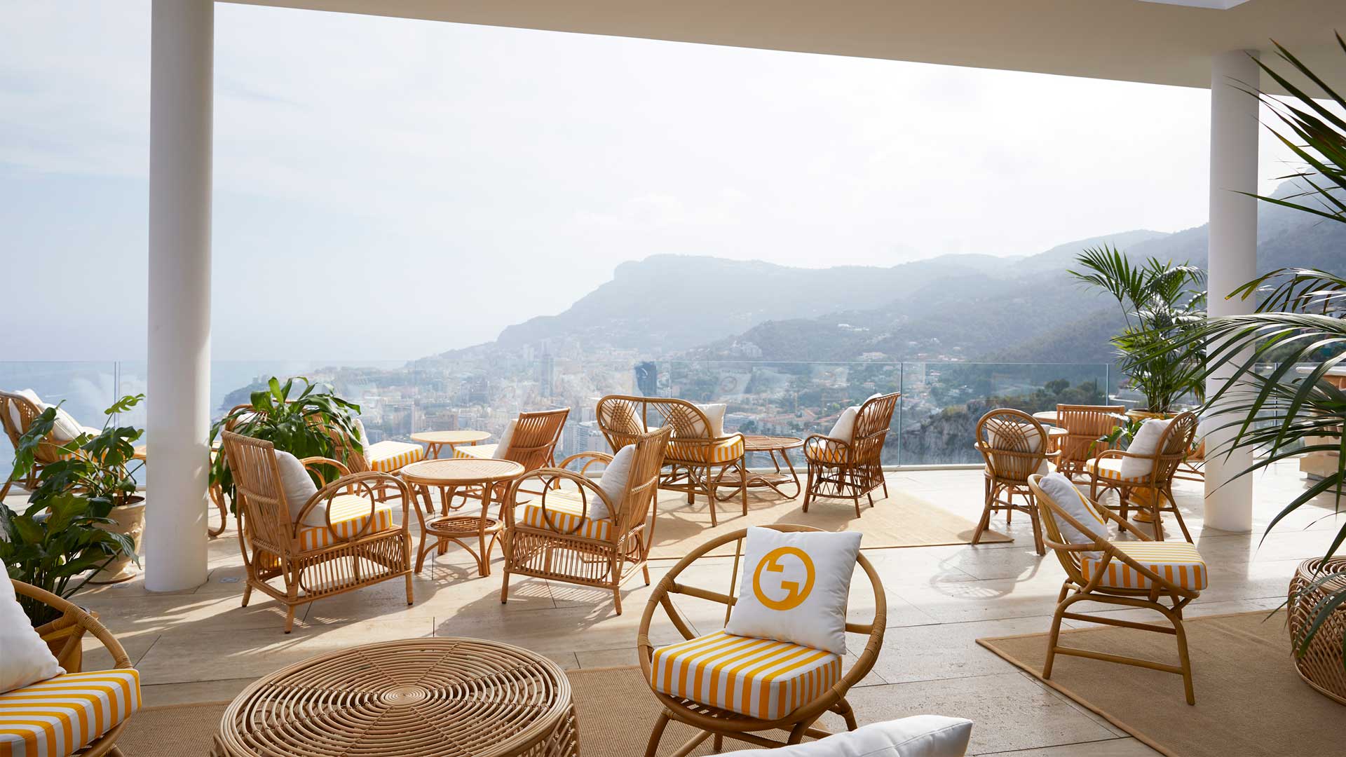 Prendendo ispirazione dalla location modernista, Gucci ha vestito il bar di Ceto con toni chiari e motivi a righe, che si combinano con le nuance naturali del legno, il lino e i dettagli in rattan. Materiali che evocano le giornate d’estate in Costa Azzurra, dove immergersi in un’atmosfera elegante, completata dall’impareggiabile vista sul mare della terrazza.
