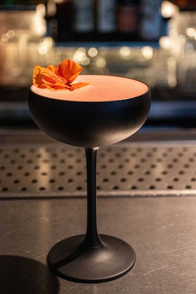 “Qui da noi i bicchieri tradizionali non sono sempre facili da reperire” ci svela il bartender. “La coppetta è utilizzata spesso per il servizio dei sour, dando un aspetto molto elegante al drink”.