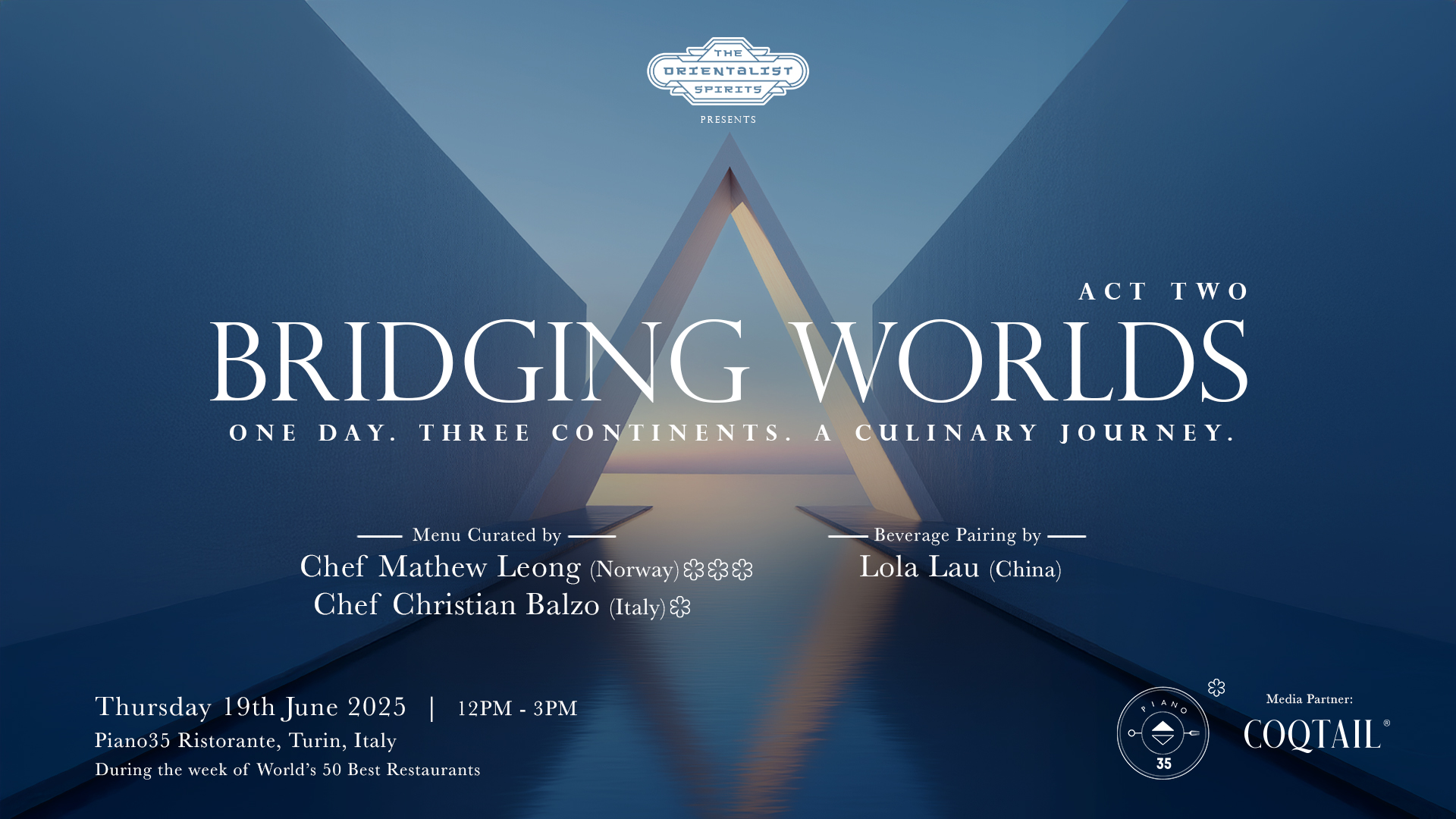 On June 18 and 19, Turin becomes a crossroads of experiences and cultures. Against the backdrop of the World’s 50 Best Restaurants week, Piano35 hosts Bridging Worlds: two exclusive events that bring together six bartenders from some of the world’s top bars, two chefs with complementary visions, and the artisanal spirits of The Orientalist Spirits.