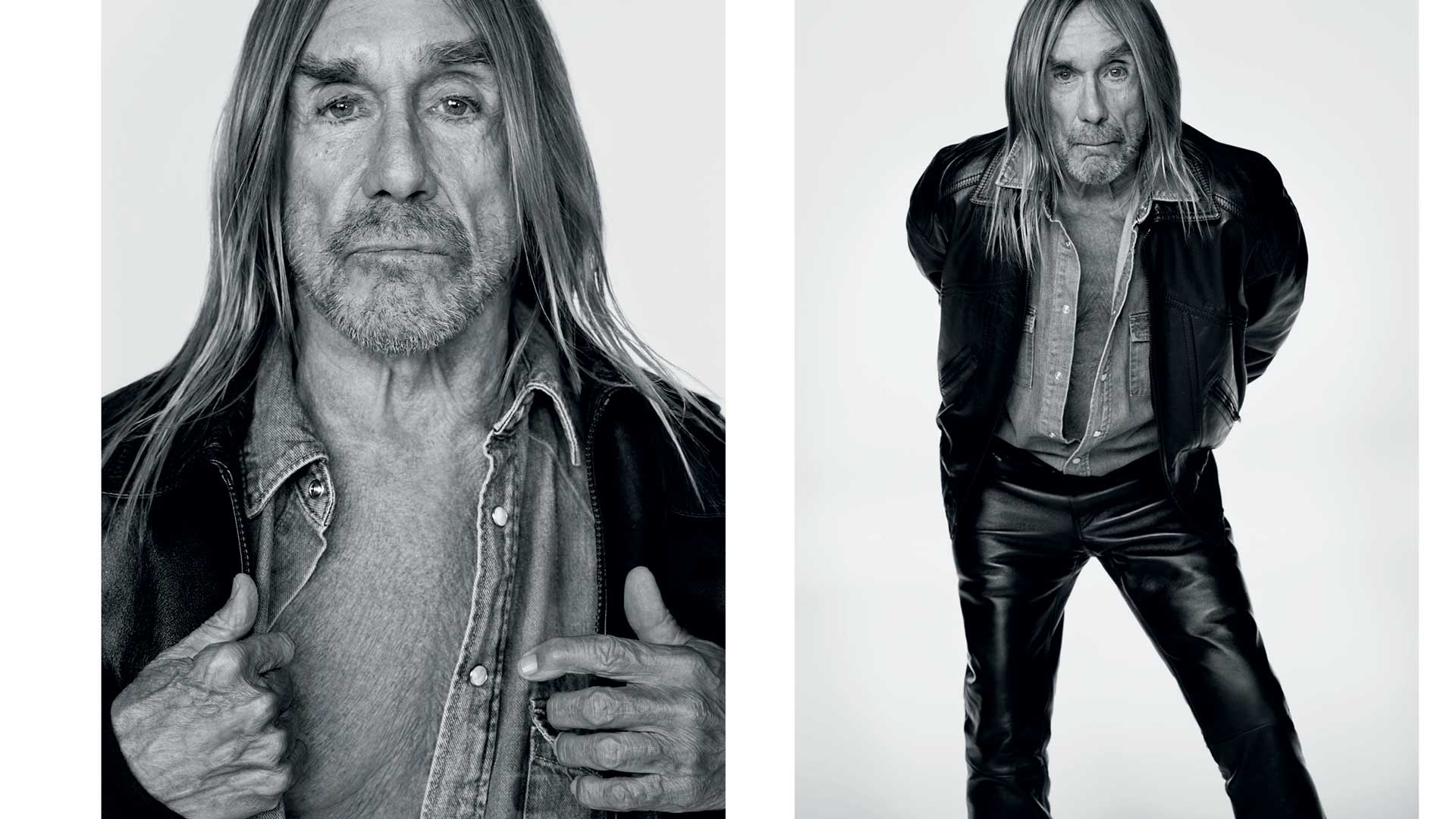 Barefoot, in leather trousers and a denim shirt, Iggy Pop grips the neck of a bottle like it were a guitar. In front of Collier Schorr’s lens, he becomes pure voltage in colour, while black-and-white portraits reveal his more instinctive, introspective side. A living legend, born James Newell Osterberg Jr. in Michigan, he started out as drummer with The Iguanas, moved on to the Prime Movers and the Stooges, and carved out a legacy with timeless tracks like Nightclubbing — immortalised in Trainspotting — and The Passenger.