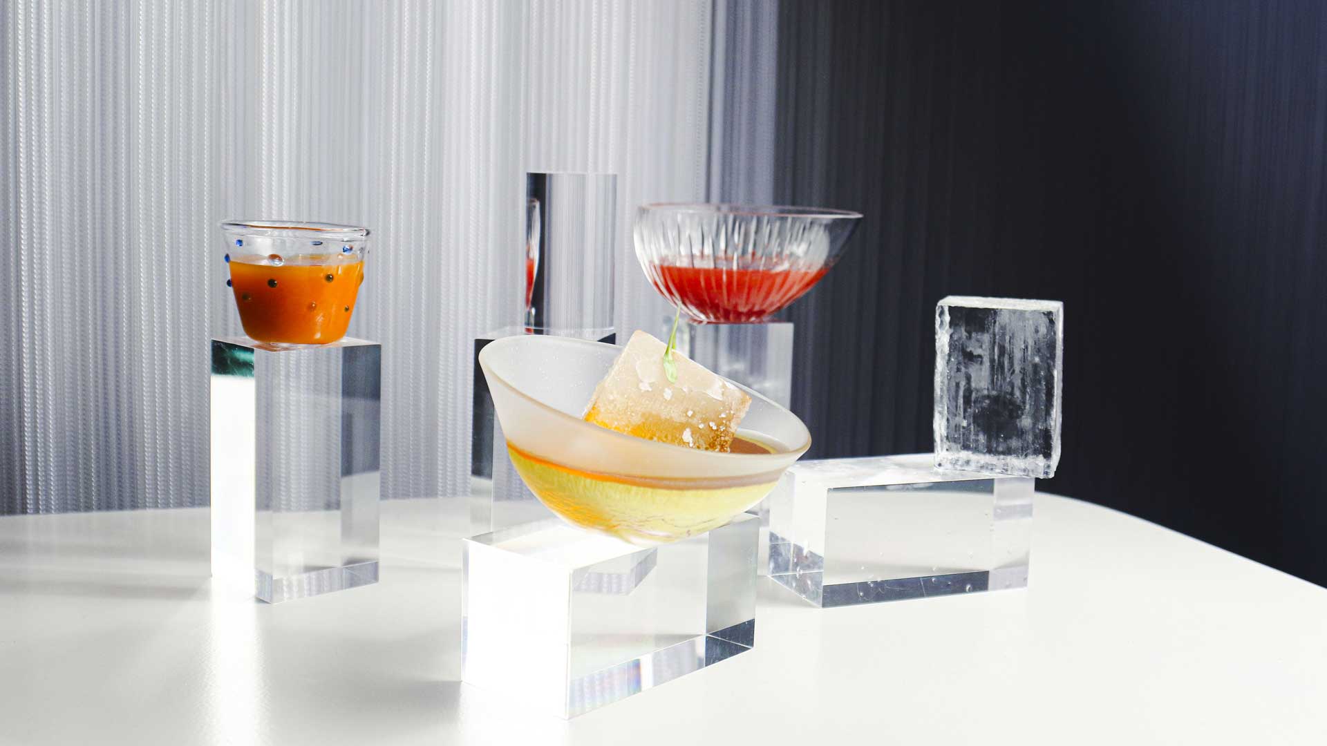 Esencia hosts just 14 guests at a time for a tasting experience that lasts between 70 and 90 minutes. No fear of excess here, “It’s comparable to drinking two Gin & Tonics,” Caporale explains. Forget picking a menu: the experience is shared by the entire table. The adventure starts with a surreal object, a viewing tool dotted with peepholes that reveal snippets of words, teasing the flavors ahead. These hints create a sense of suspense, enriching the sensory voyage through taste, sight, and touch — a fresh narrative in liquid form.