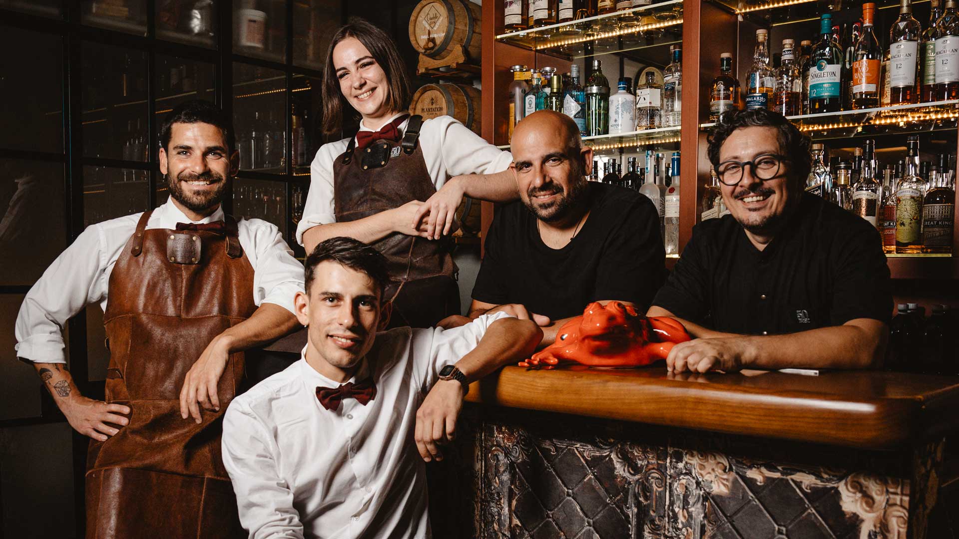 Hidden behind a wall of glossy ochre tiles in Monkey Mash is the dynamic duo’s second masterpiece: Red Frog. The emblem of this speakeasy is a whimsical red frog with black dots, presiding over the bar and making playful appearances throughout the small hall. Entry etiquette requires a knock on the door and a peek through a slot to catch a glimpse of the action at the bar.