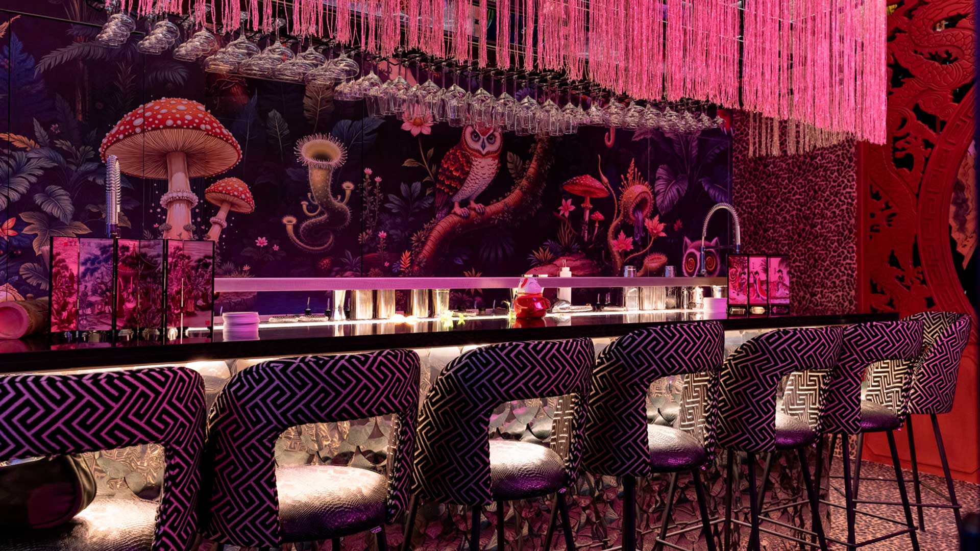 “The goal has always been to take guests on a journey around the world,” Cabrera explains. Located at Via Ezio Biondi, 4 – just across from the renowned IYO Restaurant – Salmon Guru Milan is a kaleidoscope of unique spaces. “When you walk in, you’re crossing through different countries and continents. There’s the Animal Print Room, a jungle-like area featuring fantastical creatures and the main bar; the Asian Night Room, adorned with a ceiling of oriental umbrellas; the Comic Room, lit by neon with a large social bar hiding a bartending station; and finally, a 1960s tropical speakeasy designed for about ten people,” Cabrera reveals.