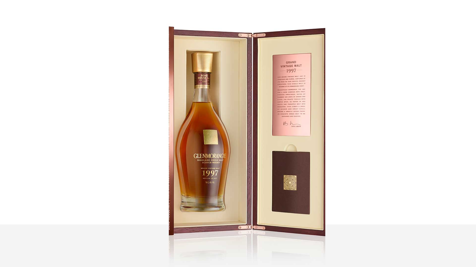 “Glenmorangie Grand Vintage Malt 1997 è un whisky radicalmente diverso, vibrante di bacche rosse e spezie formicolanti, marzapane che si scioglie e note floreali. Ispirato dal mio sogno di creare un single malt più espressivo, incarna meravigliosamente lo stile caleidoscopico di Glenmorangie”, ha detto Bill Lumsden.