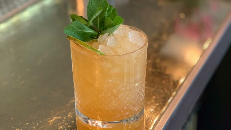 Il lime essiccato e un ciuffetto di menta donano la giusta freschezza al cocktail.