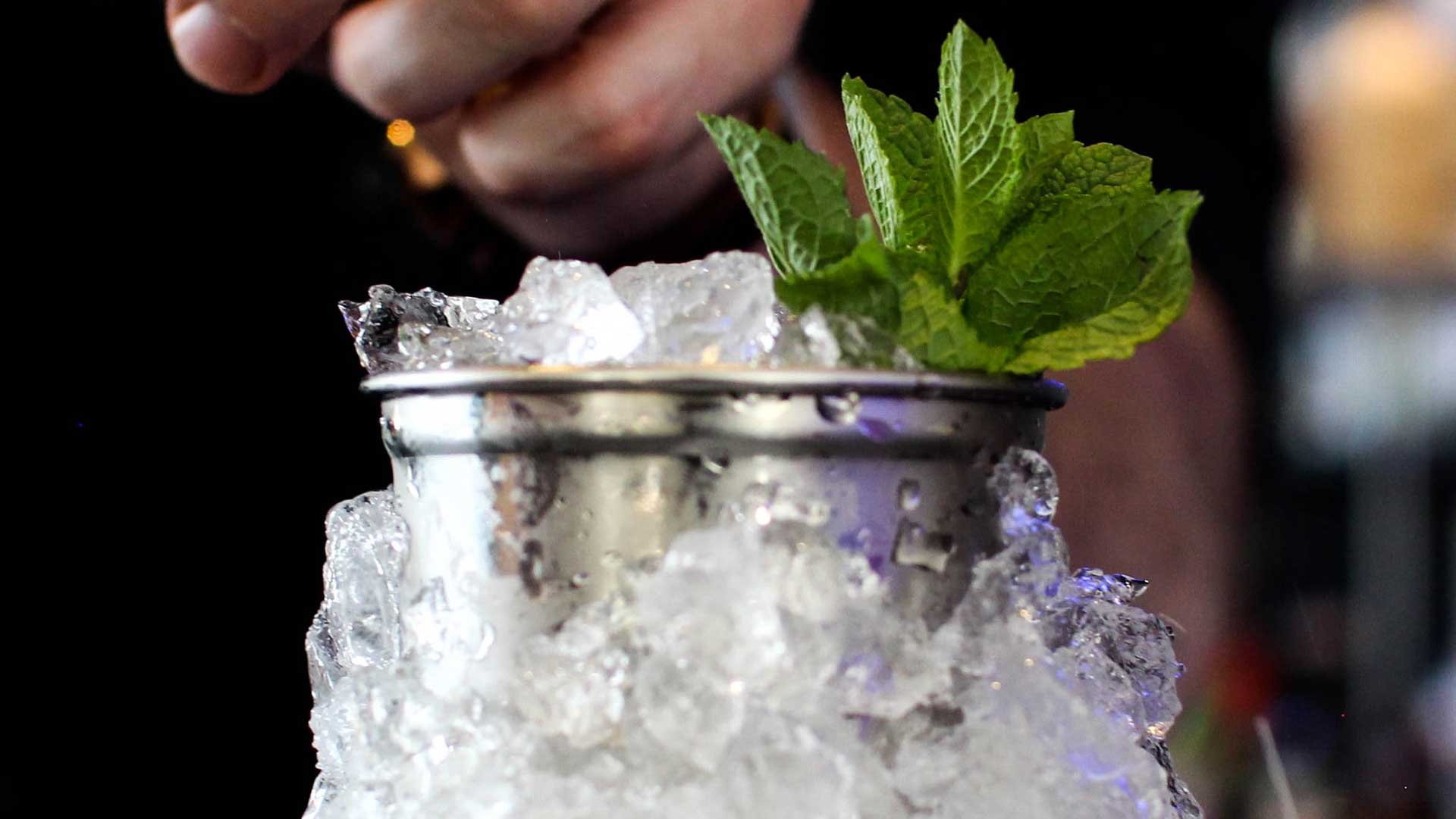 Sul fondo del Julep Tin adagiare le foglioline di menta, unire l’acqua e lo zucchero e premere delicatamente con l’aiuto di un pestello. Successivamente versare all’interno dello stesso bicchiere il ghiaccio tritato, aggiungendo progressivamente il Bourbon avendo cura di miscelare con rigore il tutto.