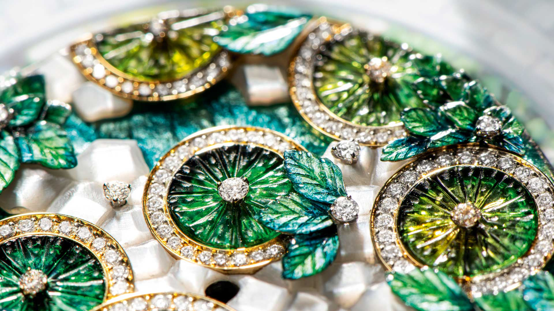Per esempio la creazione Joyful Sharing (a cui hanno collaborato Anita Parchet, la smaltatrice più famosa al mondo e il maestro incisore Dick Steenman, di origini olandesi). Il fondo dell’orologio è di madreperla scolpita su cui sono state ulteriormente scolpite le pietre preziose in modo da ricreare le foglioline di menta e le fette di lime, successivamente smaltate con colori brillanti.