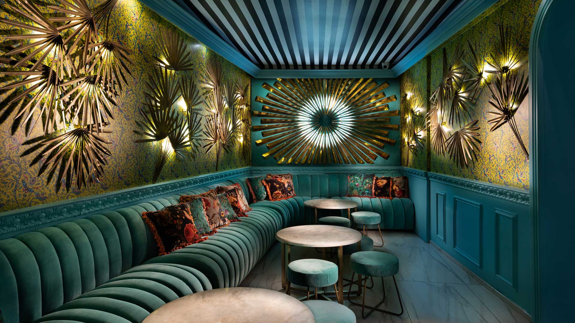Il bancone che sembra una collana di perle, la carta da parati che sfuma come ombretto sulle palpebre, le piante del locale che si arrampicano alle pareti come discorsi incantevoli.