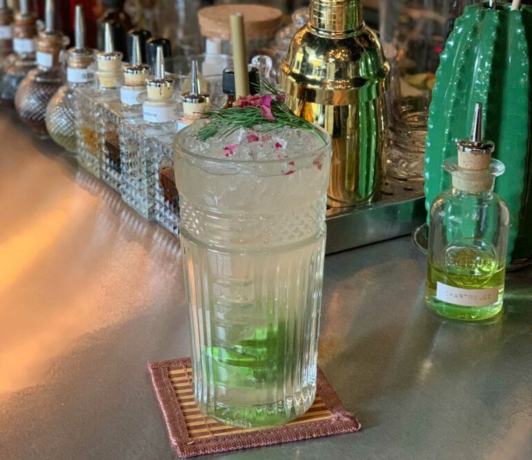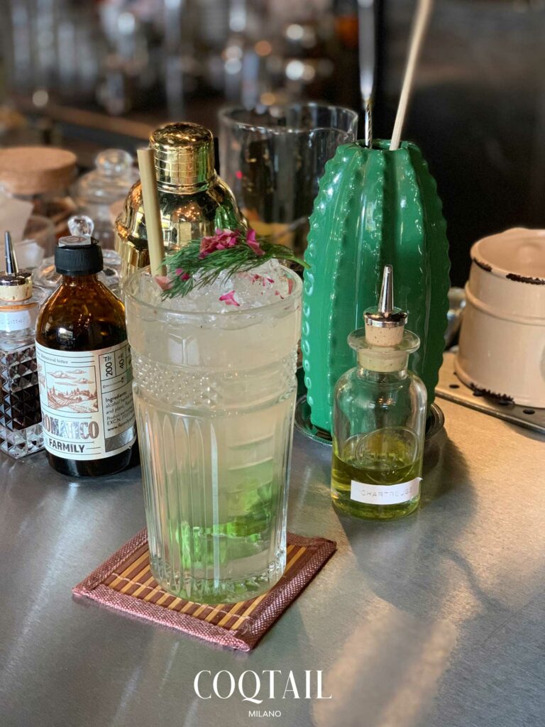 La base di partenza è uno sciroppo home-made, ottenuto unendo un decotto di cardamomo verde e un infuso ai boccioli di rosa rossa, mentre la parte amaricante è accentuata grazie allo Chartreuse, che conferisce struttura al drink e lo rende più complesso. L’ultimo tocco verde è quello del basilico, perfetto per donare freschezza e decorare il top del bicchiere.