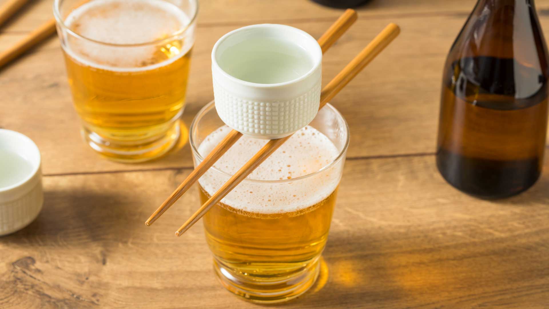 Versate la vostra birra all’interno di un bicchiere adatto. Badate a non riempirlo fino all’orlo, onde evitare che, una volta tuffato il sakè, la miscela strabordi. Sul bordo del bicchiere adagiate le due bacchette, in modo parallelo.