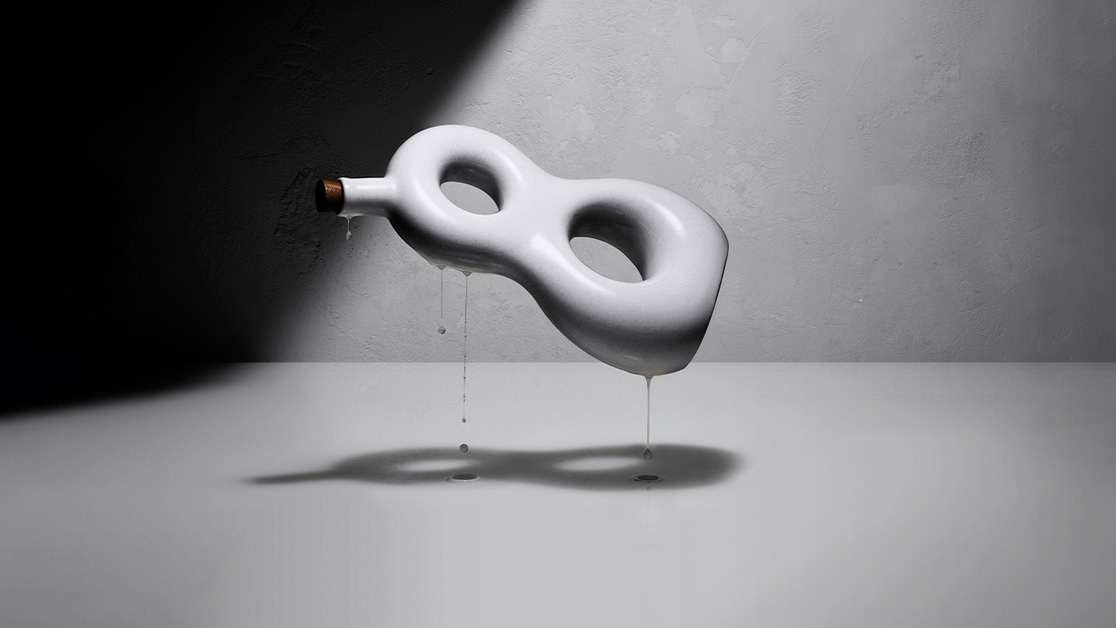 Il primo dettaglio originale è la scelta del materiale: la ceramica smaltata al posto dei più classici vetro o cristallo. Il secondo elemento caratterizzante è la forma: un 8 oppure un 1 a seconda della prospettiva da cui si guarda la bottiglia.